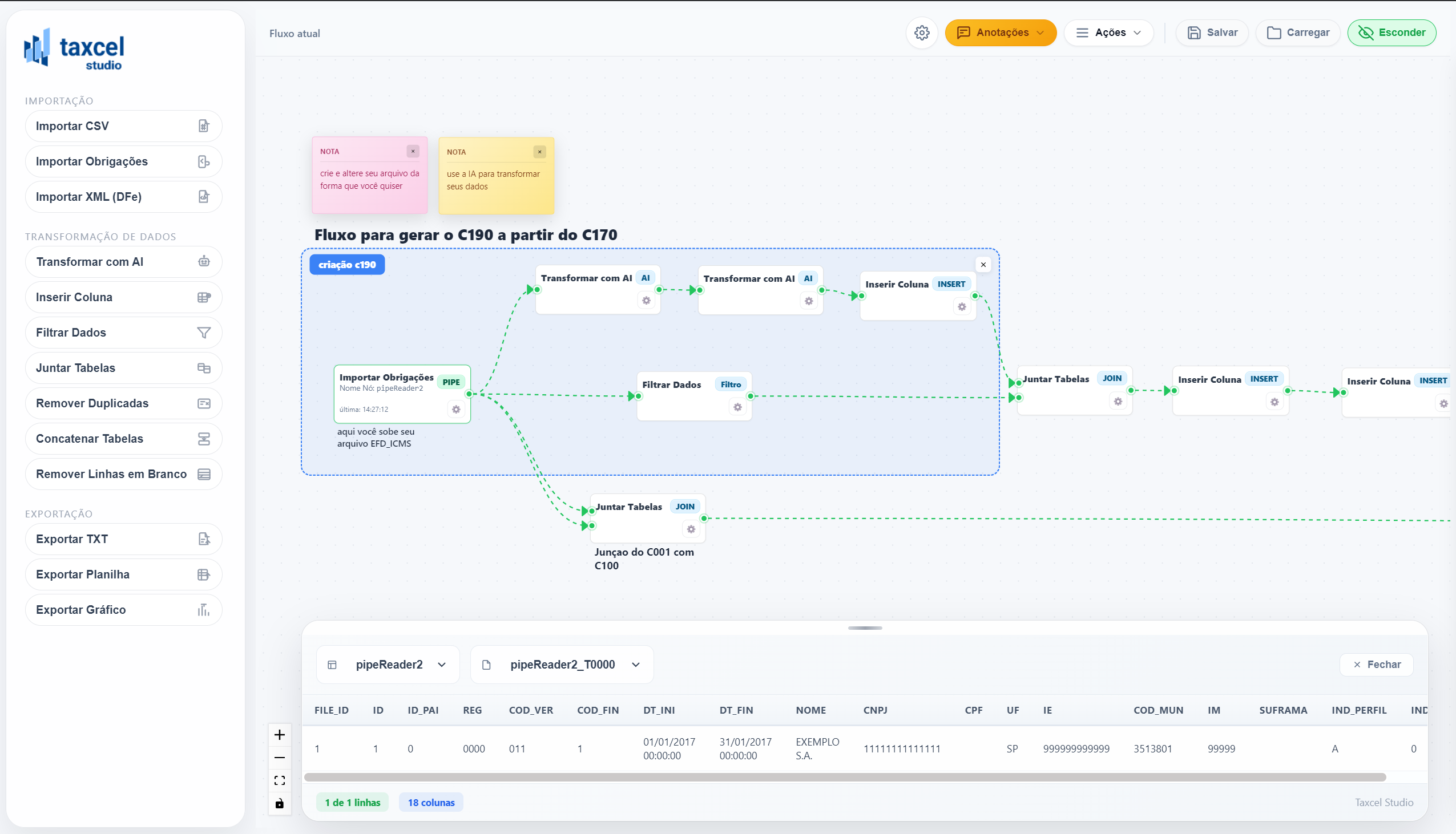 Crie e personalize fluxos de trabalho para extrair, transformar e analisar dados fiscais de forma rápida e precisa.